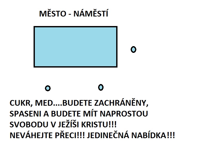 PŘEDSTAVME SI NĚJAKÉ MĚSTO, VE KTERÉM SE USKUTEČŇUJE TZV. POULIČNÍ EVANGELIZACE. JDETE TŘEBA Z NÁKUPU A ONI HRAJÍ, ZPÍVAJÍ, ČTOU Z BIBLE, SVĚDČÍ O SVÝCH "STARÝCH, HŘÍŠNÝCH" ŽIVOTECH A MAŽOU VÁM MED KOLEM ÚST, PŘESVĚDČUJÍ VÁS O TOM, ŽE JSTE TACÍ A MACÍ, MUSÍTE UVĚŘIT V BOHA SVATÉHO, JEŽÍŠE SVATÉHO A DUCHA SVATÉHO A JEDINĚ ONI VÁM POMOHOU! NIKDO JINÝ!